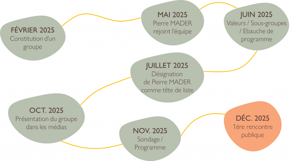 Déjà 10 mois de travail, voici les différentes étapes que nous avons traversé avant de nous présenter à vous dans le cadre de ces élections municipales